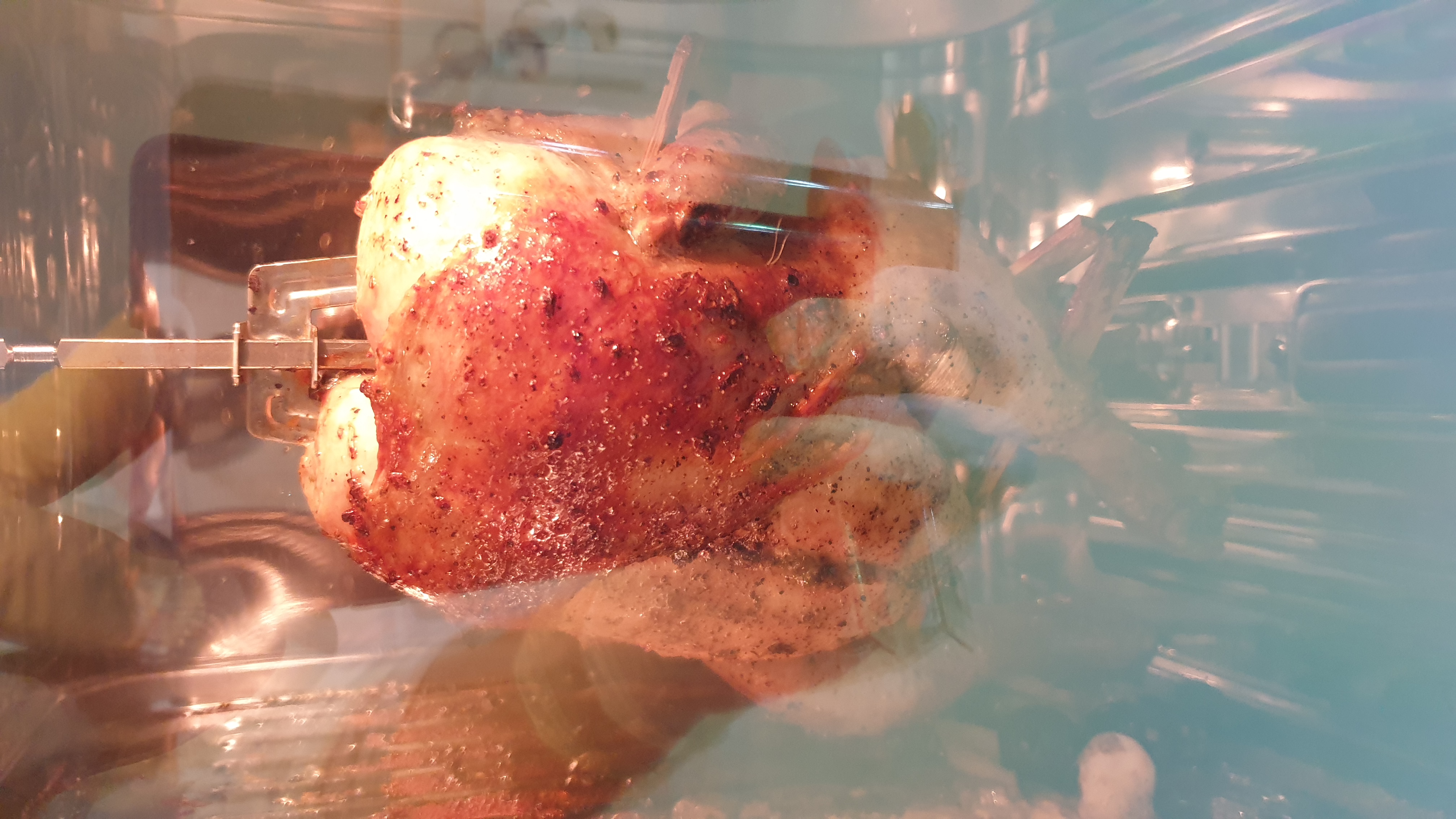 생닭의 껍질에 붙은 지방을 조금 떼어냈더니 막상 로티세리에 끼울 때 다리 부분이 고정이 잘 안되었다. 필요하다면 이쑤시개나 혹은 실로 고정을 해두면 좋을 듯 싶다. 로티세리 부품을 잘 활용해서 꽉 물어줘야 회전이 매끄럽게 잘 되고, 회전이 잘 되어야 골로루 바삭하게 구워진다.